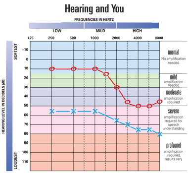 Each point located on the audiogram represents the individual’s threshold for a particular frequency, which is at a certain level of loudness. The red Os represent the thresholds for the right ear and the blue Xs represent the thresholds for the left ear.